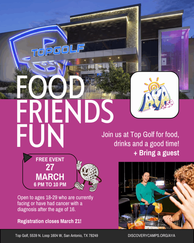 AYA in SA is our program for adolescents and young adults (AYA) between the ages of 18-29 who are currently battling or have had cancer with a diagnosis after the age of 16. The activities provided range from evening outings (dinner, movies, escape rooms, crafts, etc.) to full weekend experiences at a camp, nearby ranch, Sea World, or any other creative experience the participants suggest.